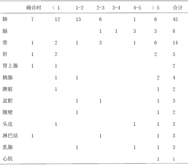 2.2 腺泡软组织肉瘤(ASPS)转移部位与时间(年)的关系