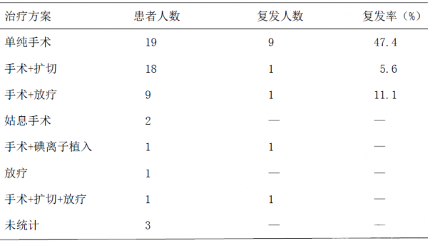 ASPS为无痛性肿块,早期生长缓慢,难以诊断,原发灶早期边界较清楚,带有不完整包膜,早期及时确诊,对原发灶扩大切除,亦或手术+放疗,可以很大程度降低原发灶复发率;如果未能对原发灶进行彻底清除,复发率将会很大程度升高。本次54例患者原发灶的治疗及疗效见表4。
