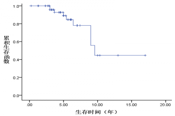 利用Kaplan-Meier绘制生存曲线并计算生存率,患者5年、10年的生存率分别为89.0%、44.6%,从图上可以看出生存率曲线没有明显的平台期。
