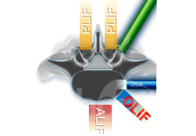 目前,临床上应用的腰椎椎间融合术种类繁多,根据手术入路方式不同,可分为后入路(Posterior LIF)、关节突(Transforaminal LIF)、前入路(Anterior LIF)、侧入路(Extreme lateral LIF)、斜入路(Oblique LIF)等。