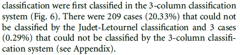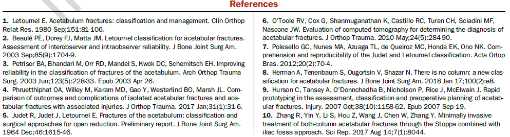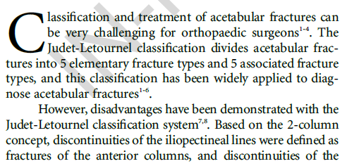 Letournel-Judet分型基于双柱理念将髋臼骨折分为5型简单、5型复杂骨折,已成为髋臼骨折诊断中最为常用的分型系统。然而,该分型存在包括不全、难以理解、容易混淆等弊端,充分掌握该分型需要较长的学习曲线;且其并未对各类型骨折的治疗提供指导,故其临床应用存在一定的局限性。