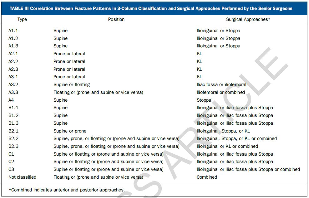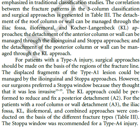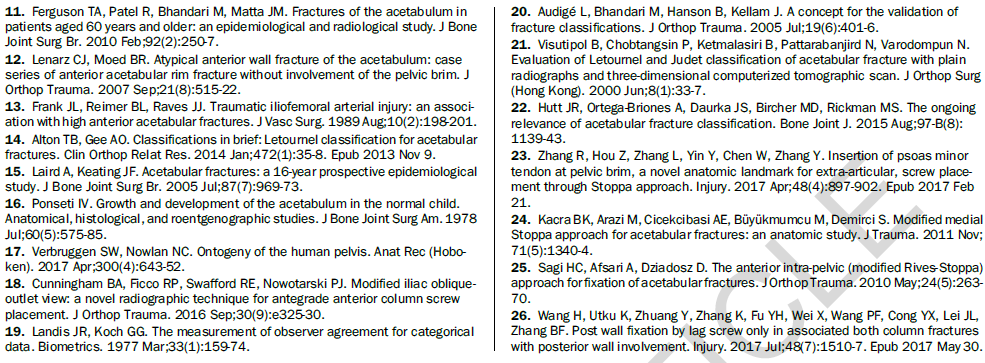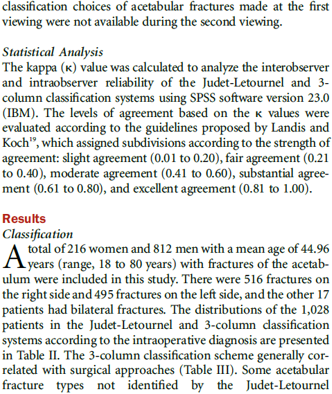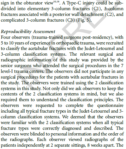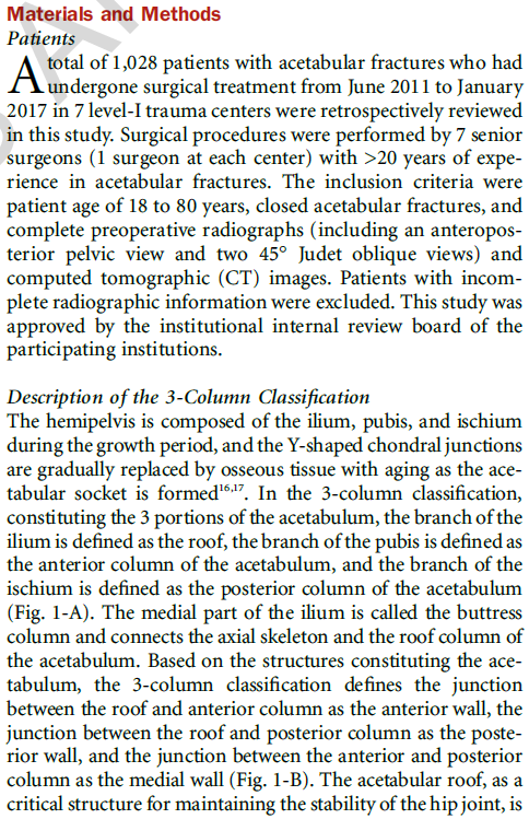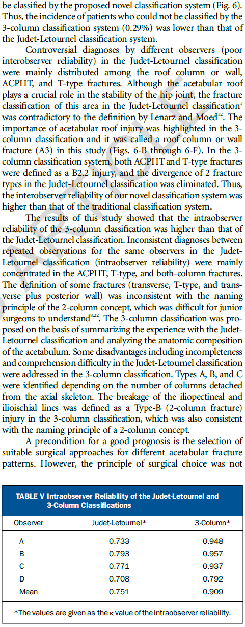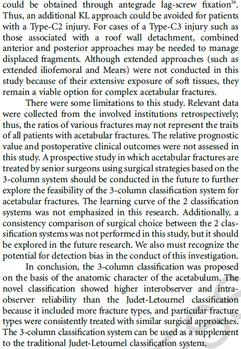 通过两种分型系统对来自七个一级创伤中心的1028例髋臼患者进行对比研究,显示三柱分型具有更高的一致性和可重复性;且基于该分型的手术入路具有很好的规律性,可为骨科同仁手术的选择提供参考。国内外学者一致认为该分型是对传统髋臼骨折分型的颠覆性创新,可能会成为创伤骨科领域程碑式的进展。