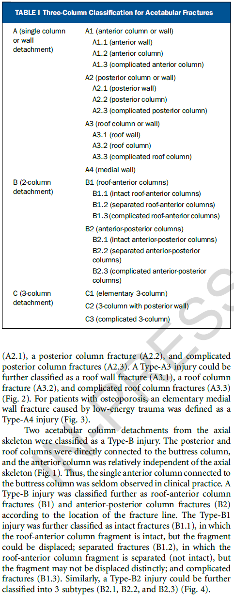 河北医科大学第三医院张英泽院士、侯志勇教授团队基于髋臼的解剖结构提出了髋臼骨折的三柱分型,将髋臼骨折分为单柱骨折、两柱骨折、三柱骨折三大类。该分型囊括骨折类型多、分型规律性强,解决了Letournel-Judet分型中的诸多问题,便于初学者掌握。