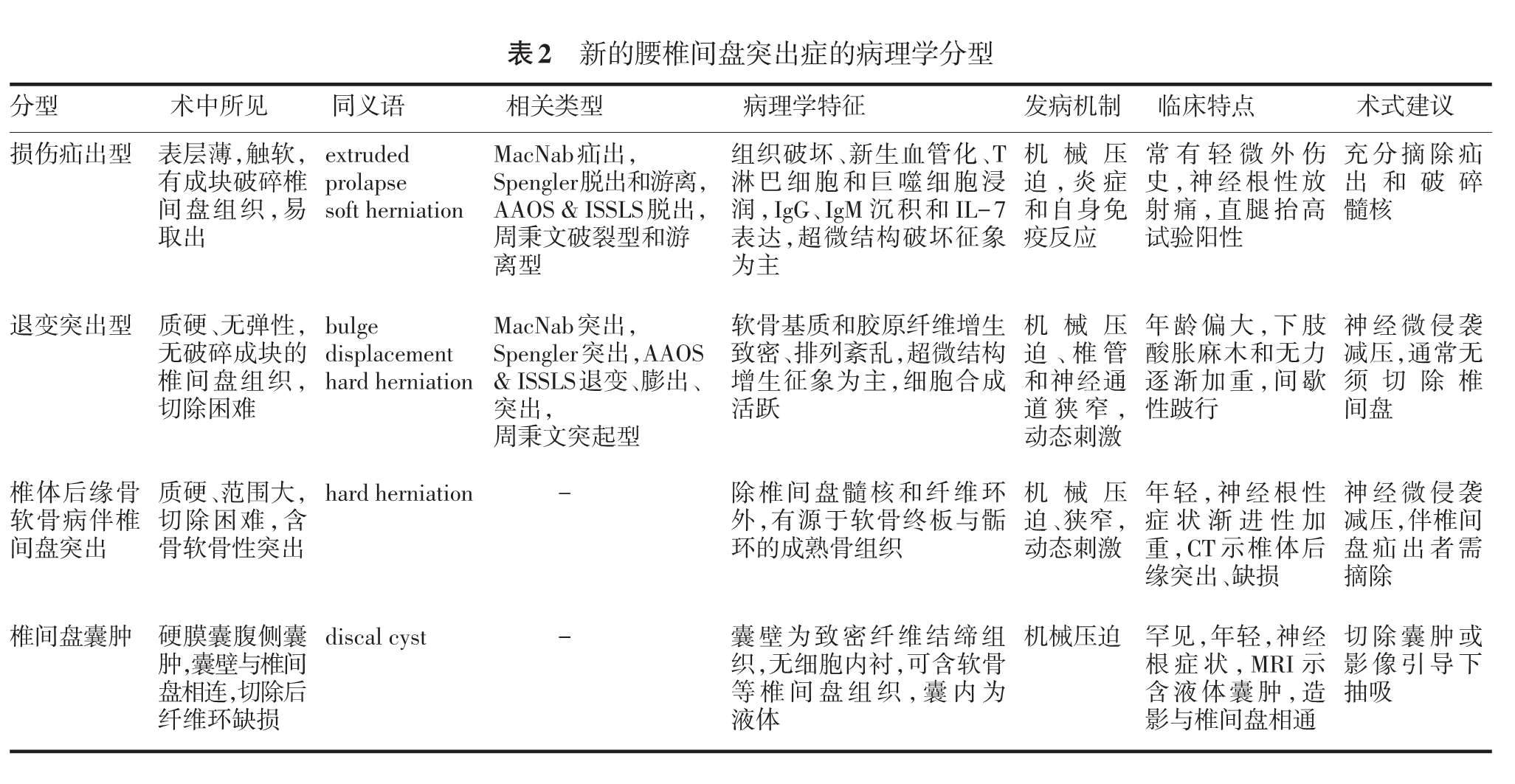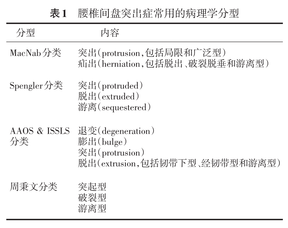 关于腰椎间盘突出症的病理学分型历来都存在较多争议。比较常用的有 MacNab分类、Spengler分类、美国矫形外科医师学会(American Academy of Orthopaedic Surgeons, AAOS)&国际腰椎研究会(International Society for the Study of Lumbar Spine, ISSLS)分类等。MacNab分类分为突出(protrusion)和疝出(herniation),前者包括局限和广泛型,后者包括脱出、破裂脱垂和游离型[1]。Spengler分类分为突出(protruded)、脱出(extruded)和游离(sequestered)[2]。 AAOS &ISSLS 分类分为退变(degeneration)、膨出(bulge)、突出(protrusion)和脱出(extrusion),后者又分为韧带下型(subligamentous)、经韧带型(transligamentous)和游离型(sequestrution)[3]。这种分类将疝出作为统称,与 MacNab 分类的疝出相矛盾。国内周秉文等[4]则将腰椎间盘突出症分为突起型、破裂型和游离型(表 1)。因此,目前临床上对腰椎间盘突出症的分型仍较为混乱。