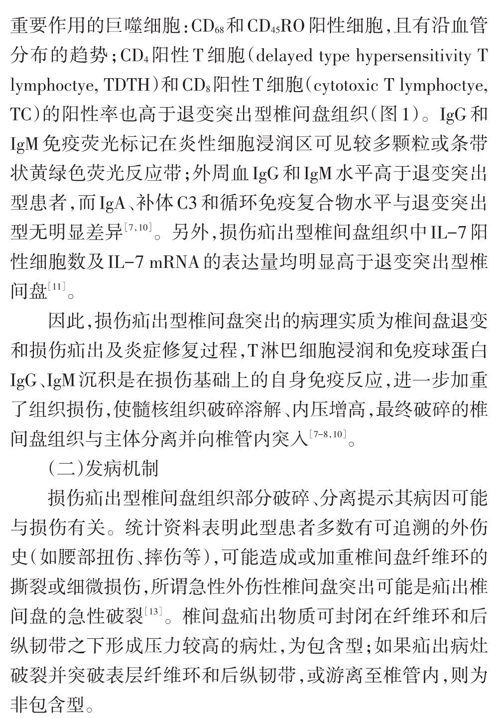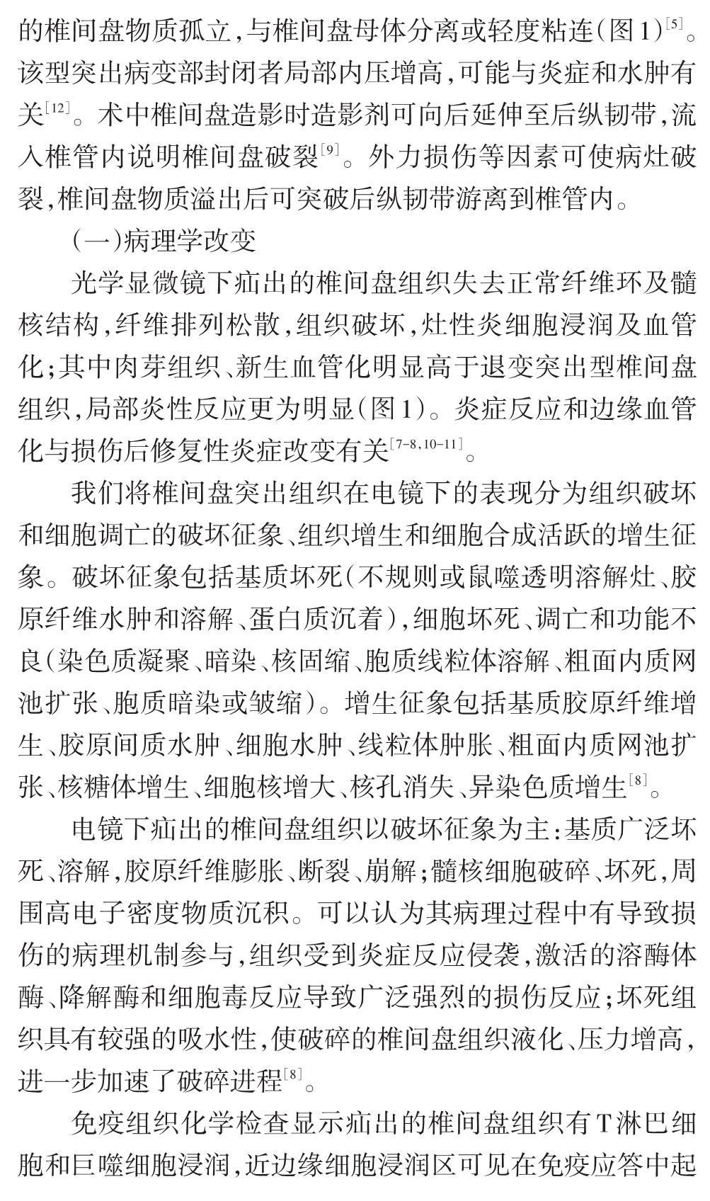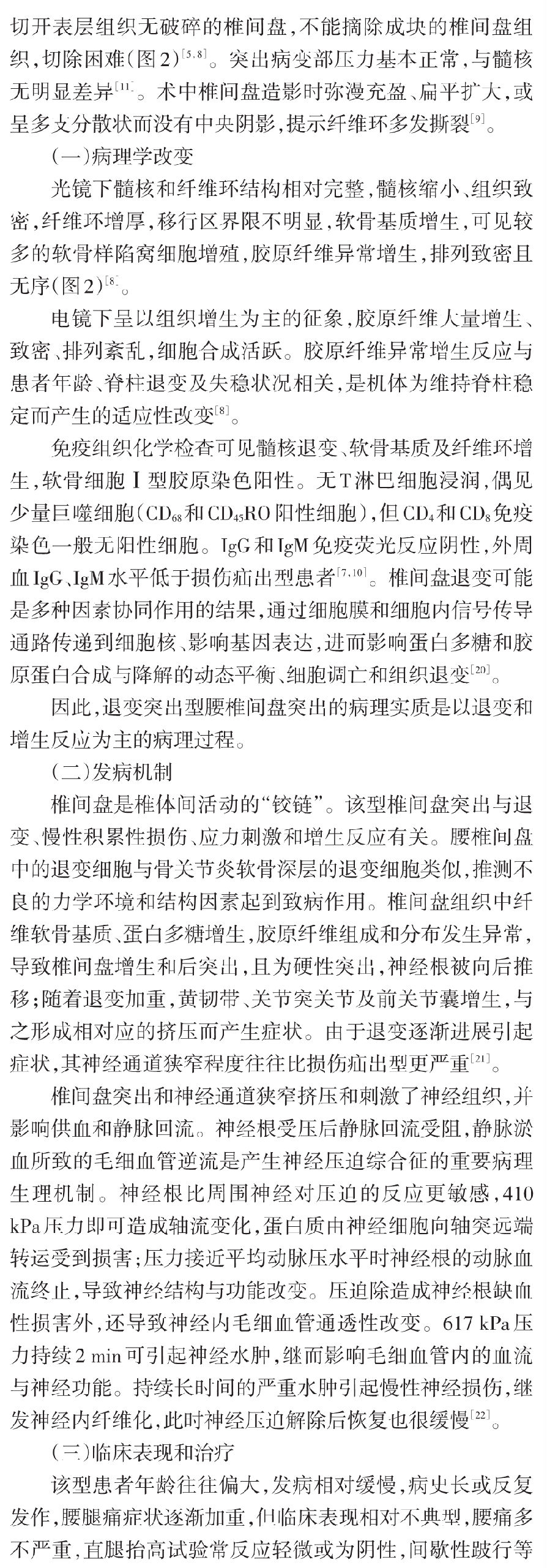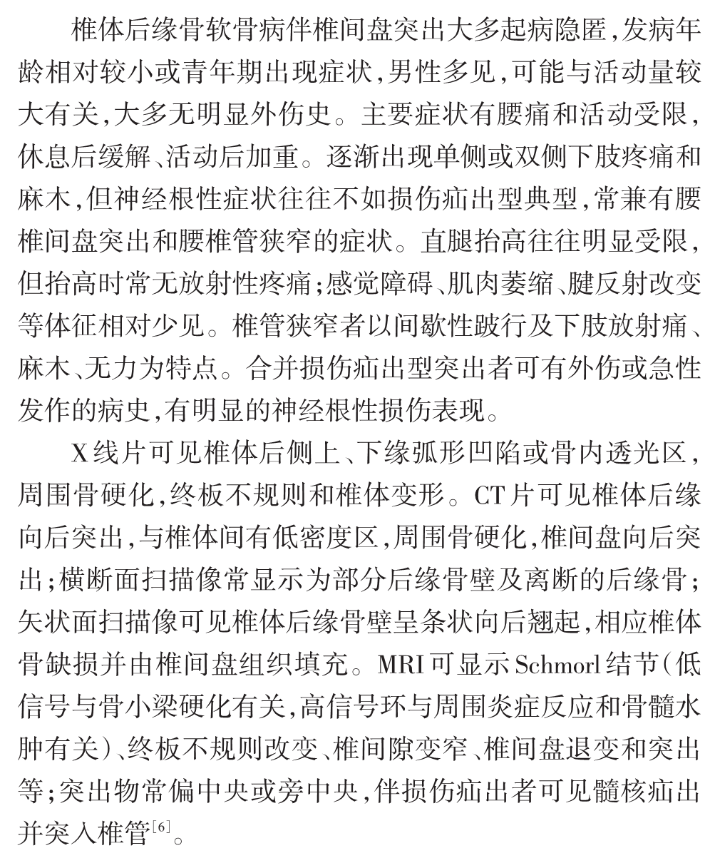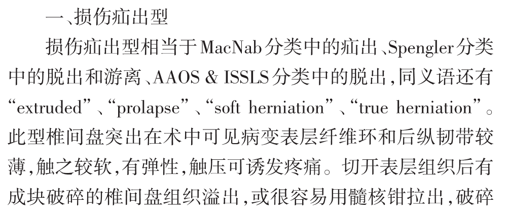 我们在临床实践中发现腰椎间盘突出症在大体病理、免疫学等方面存在较大差异,病变周围组织也有不同的病理改变,存在不同的发病机制,其治疗措施包括手术方法因不同的病理变化而有所差异。基于以上认识,我们在以往分类方法的基础上提出一种新的腰椎间盘突出症病理学分型,分为损伤疝出型、退变突出型、椎体后缘骨软骨病伴椎间盘突出和椎间盘囊肿四型[5-11],并建议根据不同的病理类型进行临床评估,包括手术方法的选择。