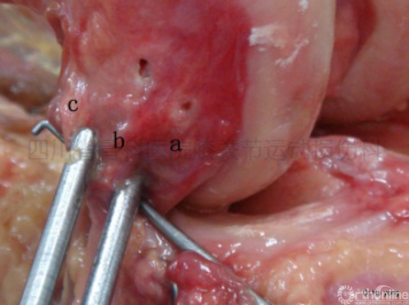 a点标示为腘肌腱;b点标示为外侧副韧带;c点标示为腓肠肌外侧头。