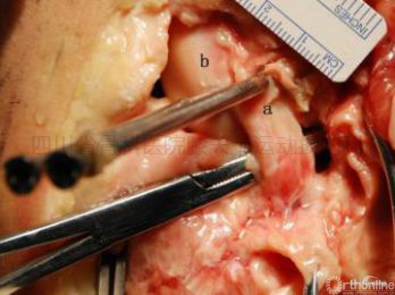 a点标示为腘肌腱;b点标示为股骨外髁下缘的关节软骨。