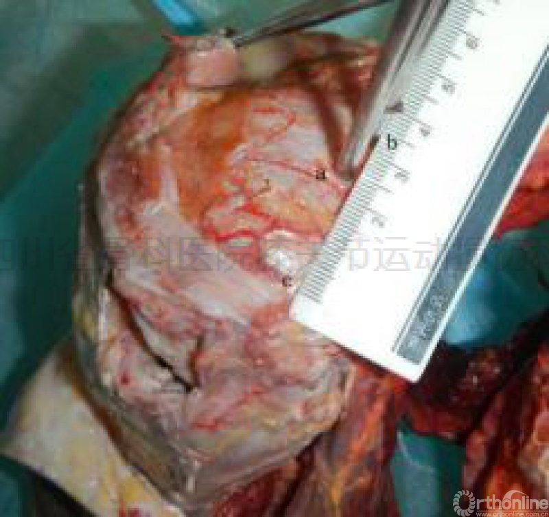 鞘管击入点,c点为内侧副韧带股骨止点。击入点与该韧带之最短距离>25mm。