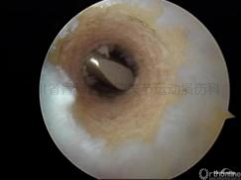 同年,作者在临床使用经胫骨隧道的RigidFix横穿股骨框架及配套导针和鞘管,采用逆向横穿技术实施临床手术(图示八)。