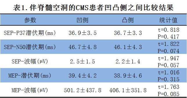 最终,73例患者中71例(97.3%)患者术中成功获得SEP监测基线,73例(100%)患者成功获得MEP监测基线。伴脊髓空洞组共16例(28.1%)患者有异常SEP,不伴脊髓空洞组共5例(35.7%)患者有异常SEP(p=0.745)。独立样本t检验示伴脊髓空洞的CMS患者中SEP的P37潜伏期(P=0.417)、 N50潜伏期(P=0.074)、波幅(P=0.057)在凹凸侧之间均无显著统计学差异性;MEP的潜伏期(P=0.315)及波幅(P=0.085)在凹凸侧之间无显著统计学差异(表1)。