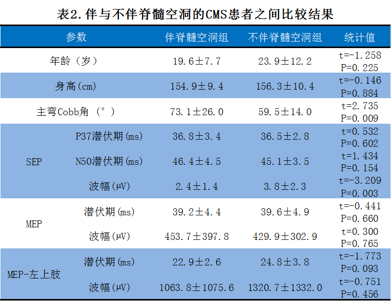 本研究进一步比较了伴与不伴脊髓空洞的CMS患者IOM监测的差异性,结果发现伴脊髓空洞组的CMS患者主弯Cobb角显著升高、SEP波幅显著降低。因此,本研究结果提示伴脊髓空洞的CMS患者具有较高的侧凸进展风险和进展速率,且脊髓空洞对CMS患者SEP的损害主要表现在波幅的降低上,这在临床工作中需要引起脊柱外科医师的高度重视。
