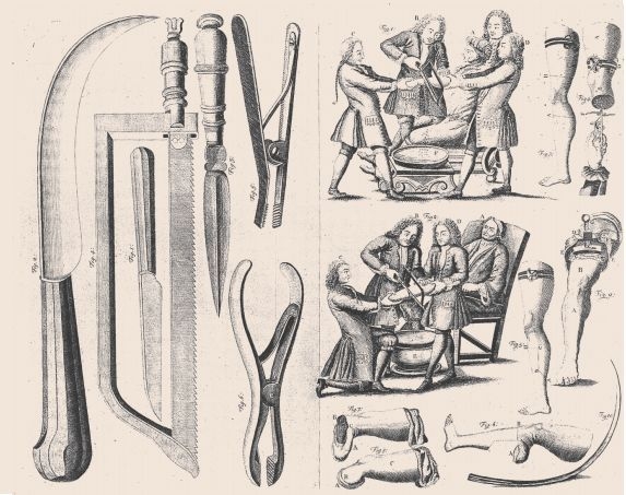 这听起来可能很吓人,但如果是一个受重伤的士兵,你可能也会想要一个迅速的香肠斩。16—19 世纪,一次典型的腿部截肢是这样进行的:病人被强力压住,以防止其移动(可能也是为了转移他们的注意力和恐惧),一条止血带用来阻隔腿部的主动脉。医生使用一把弯刀,切开骨头外的皮肤、肌肉,最理想的是一刀切好,然后把骨头锯开。有时候,开口的血管会使用灼术来处理(用热铁、沸油或是含硫酸盐的化学药物);肉呢,要么就不处理,要么缝起来。