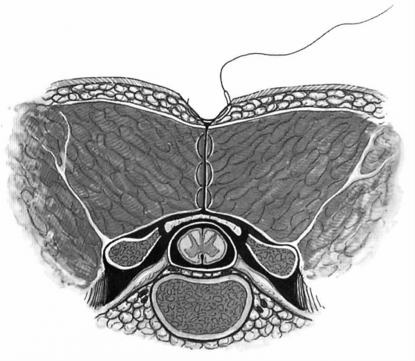 彻底止血后,将一小块打湿的明胶海绵或脂肪块松松地放在椎板开窗缺损处以填塞死腔。小心取出自动拉钩,应避面粗暴地取出带齿的牵开叶片或牵开钩而对周围肌肉及韧带组织造成不必要的损伤。手术显微镜下彻底检查椎旁肌出血情况并止血。