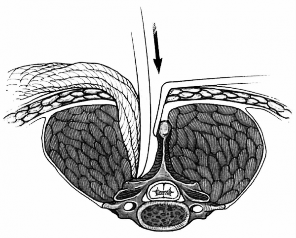 使用棘突作为解剖标志,在手术节段做一后正中切口。如只需显露单个神经根,以手术的椎间隙为中心,切3厘米长的手术切口足以完成椎板间隙的显露。如需要显露多个节段,则需要行较长的切口跨过拟手术的多个节段。
