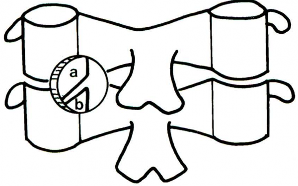 在“锁孔”椎板开窗手术中,上位椎板咬除时黄韧带对神经结构有保护作用(a),但下位椎板咬除时(b),黄韧带对神经组织的保护作用有限,建议使用1毫米的Kerrison咬骨钳