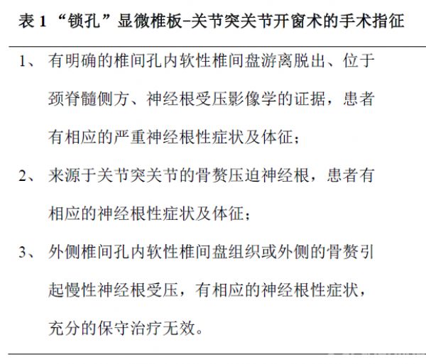 “锁孔(Keyhole)”椎板-椎间孔开窗术已广泛用于椎间盘向外侧游离脱出致软性压迫或颈椎退变骨刺突入椎间孔致硬性压迫单一神经根的后路减压术中。将手术显微镜应用到该手术中,降低了围手术期与软组织剥离、骨组织显露有关的并发症,提高了在敏感的神经结构周围实施手术的安全性。