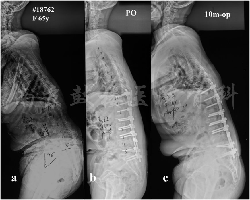图4 女,65岁。X片示矢状面严重失平衡(a),术前存在右下肢不全瘫;原定手术方案为L4 PSO截骨术,但术中出现MEP事件,且出血较多,因此未行三柱截骨,仅行后路减压及内固定术,术后X片示矢状面形态稍有改善,但是没有达到矫形的目标(b);术后10个月随访,患者躯干失平衡较术后加重,与术前类似(c)。该患者证明如果手术没有很好地重加矢状面形态,将是内固定失败和矫正丢失的重要危险因素