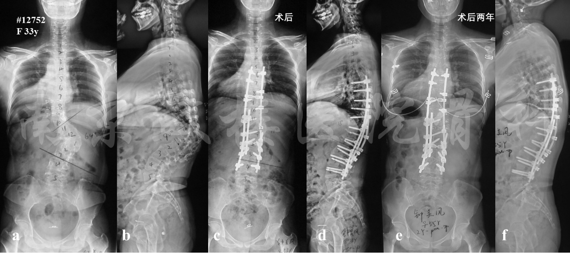 图5 女性,33岁,成人先天性脊柱侧后凸畸形。X片示T12楔形变,胸腰段角状侧后凸畸形(a, b),行T12全脊椎切除术(T12 VCR),并于截骨区使用卫星棒加固(c, d),术后两年无内固定失败或矫正丢失(e, f)