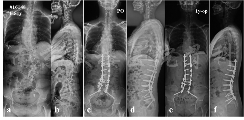 图6 女,51岁。X片示冠状面Cobb角50°,矢状面无明显失平衡或腰椎后凸(a, b),因此无需进行三柱截骨,行后路T10-S2内固定,L4/5、L5/S1 TLIF(c, d),术后1年,内固定在位,融合好,冠矢状面平衡保持良好(e, f)