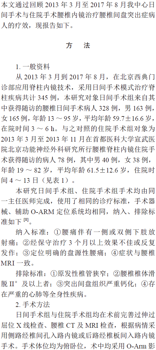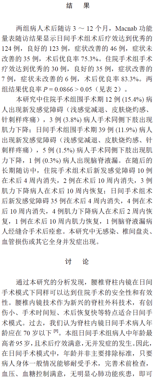 目的:通过分析328例腰椎内镜日间手术术后随访情况,并与住院手术相比较,评价其有效性。