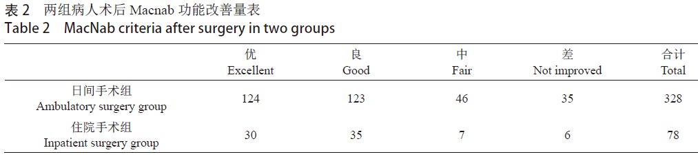 结果:328例日间手术组术后优良率75.3%,78例住院手术组术后优良率83.3%,两组术后疗效无明显统计学差异(P>0.05),且两组均无远期手术并发症。