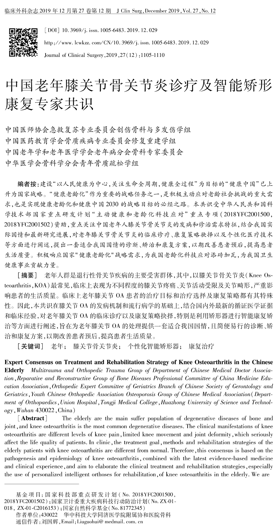 2019年12月,由科技部国家重点研发计划重点专项(2018YFC2001500, 2018YFC2001502)、国家卫计委重大疾病科技行动防治计划(ZX-01-018,ZX-01-C2016153)、国家自然科学基金(81772345)等基金课题资助下,中国医师协会急救复苏专业委员会创伤骨科与多发伤学组,中国医药教育学会骨质疾病专业委员会修复重建学组,中国老年学和老年医学学会老年病分会骨科专家委员会,中华医学会骨科学分会青年骨质疏松学组的专家,共同设计起草的《中国老年膝关节骨关节炎诊疗及智能矫形康复专家共识(2019)》正式发表于《临床外科杂志》,这是中国在该领域内发表的第一部专家共识。