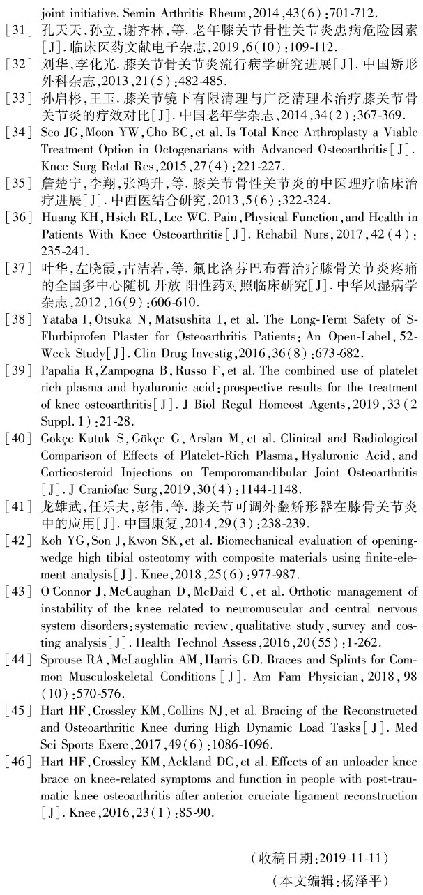 3. 老年膝关节OA的矫形器治疗:膝关节矫形器的分类多种多样,可以根据材料、结构、作用的不同分为不同的种类。(1)限位型矫形器;(2)可调节式矫形器;(3)个性化智能动态矫形器。