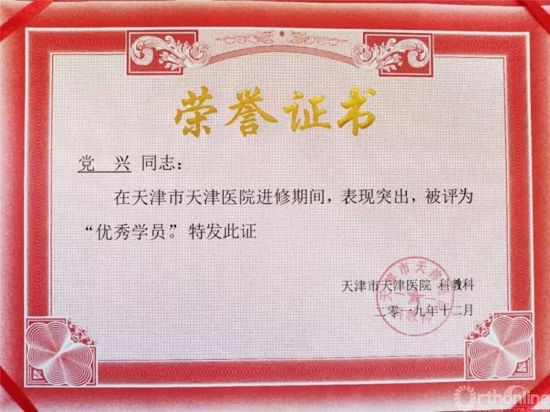 光阴荏苒,近一年的进修生活转瞬即逝。感谢天津医院对我的认可,在百余位骨科进修同道中授予我“优秀进修医师”称号,这也是对我学习成果的肯定!