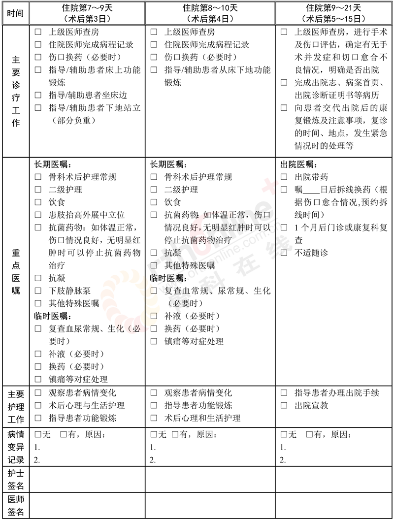 (4)术后预防深静脉血栓栓塞症的处理:参照《中国骨科大手术后静脉血栓栓塞症预防指南》(《中华骨科杂志》,2016,36(2):65-71)。