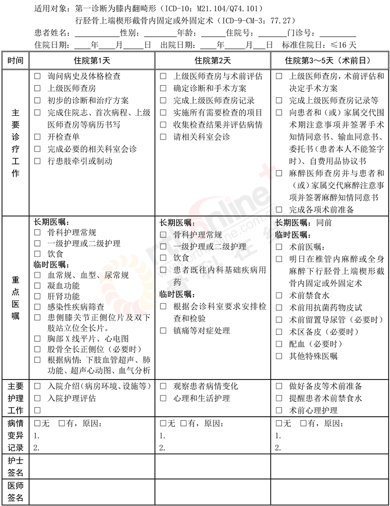 二、膝内翻胫骨高位截骨临床路径表单