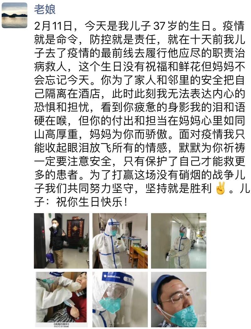 亲爱的老公:正月十六是你的生日,以往每年这个时候我都会订一个漂亮的生日蛋糕,亲自下厨炒几个你爱吃的菜,和儿子一起祝你生日快乐。今年我身在抗击新冠肺炎一线,已经半个多月没有回家了,通过视频看到平常不会做饭的你把儿子的一日三餐安排的妥妥当当,还要负责儿子的网络课程辅导,既免除了我的后顾之忧,还要为我担惊受怕,你辛苦了!待到抗击新冠肺炎胜利,樱花烂漫时,我一定为你和儿子做一顿大餐。