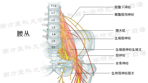 腰丛与腰大肌关系密切,在前入路和前外侧入路中根据手术平面的高低,注意保护腰丛的分支,生殖股神经最表浅。