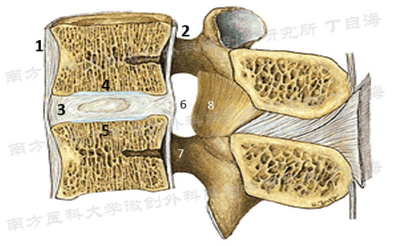 1.前纵韧带 2.后纵韧带 3.椎间盘 4.下终板 5.上终板 6.椎间孔 7.椎弓根 8.黄韧带(1~5被称为椎间盘功能单位)