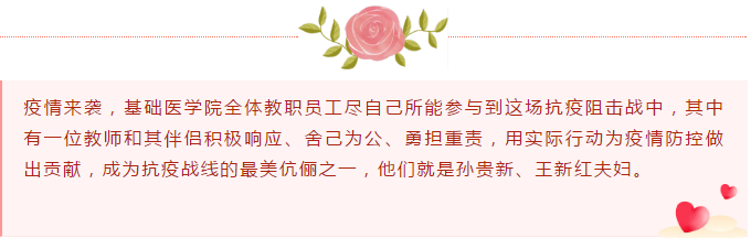 在疫情爆发后,王老师主动提出代替在外地不能回沪的老师在系室值班,用实际行动支持着丈夫和所有奋战在一线的勇士们,共同唱响“人生意义何在乎?为人们服务;服务价值何在乎?为人群灭除痛苦”的高尚旋律。