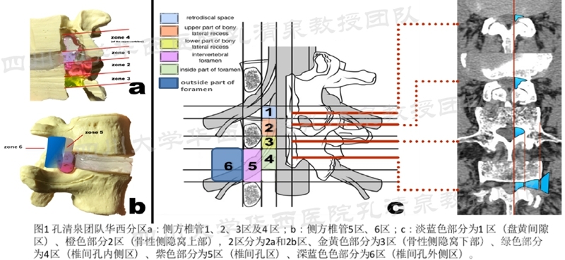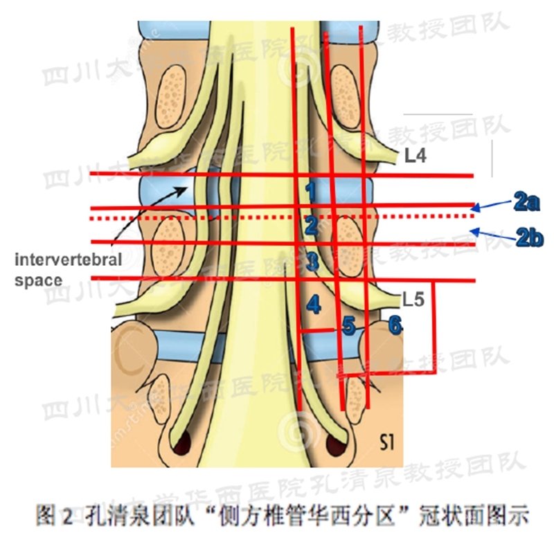 2018年在大量临床研究和解剖数据分析的基础上,四川大学华西医院孔清泉教授团队沿用“腰椎侧方椎管(LLSC)”的概念并重新明确定义,提出了“腰椎侧方椎管华西分区”,该分区将侧方椎管总共分为6区(2区分为2a、2b区),其中包括椎间孔区和椎间孔外侧区域。