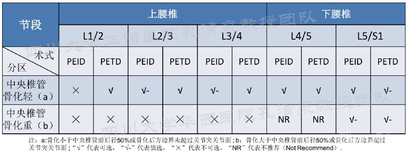 表1: PED技术应用于侧方椎管狭窄-孔清泉教授团队建议