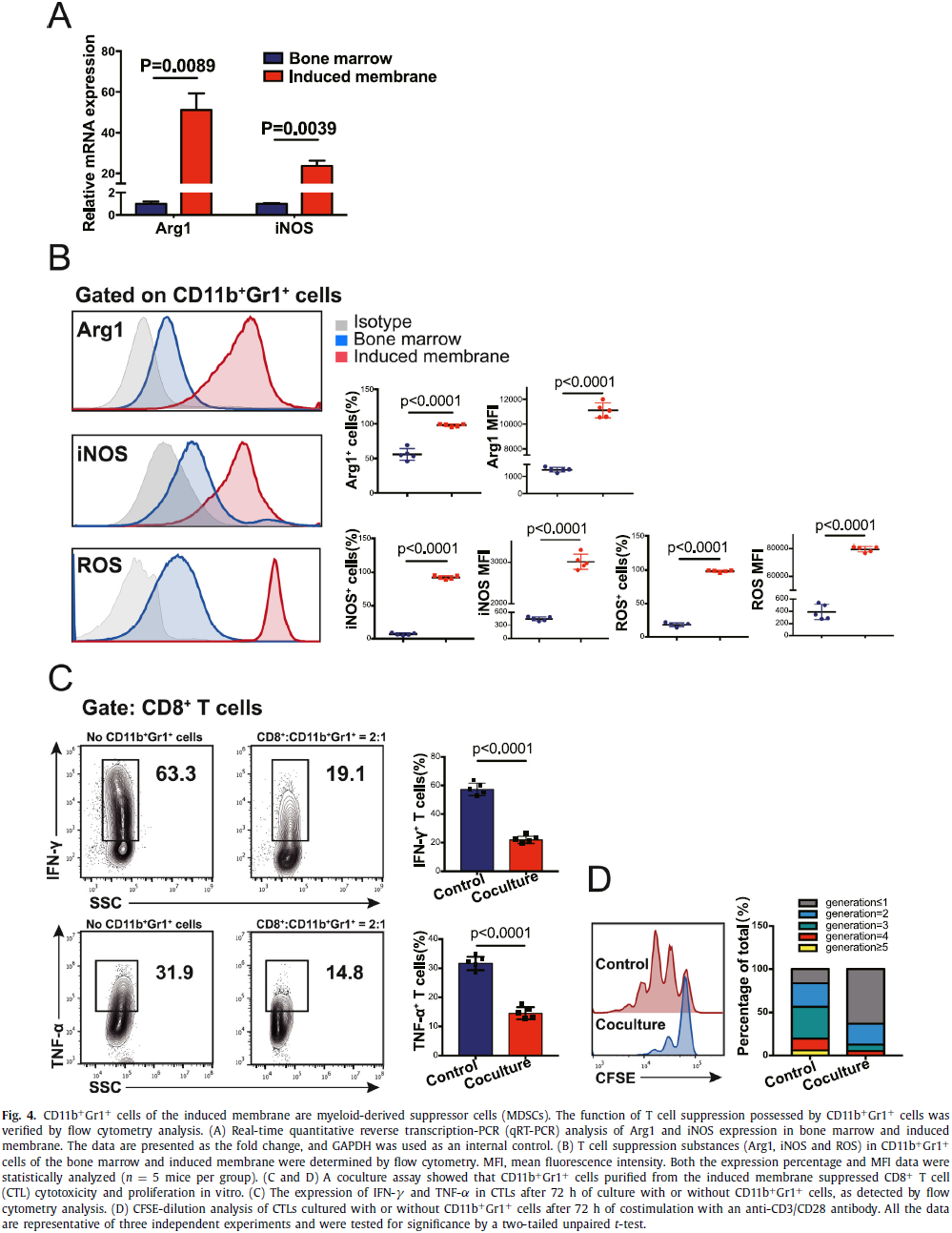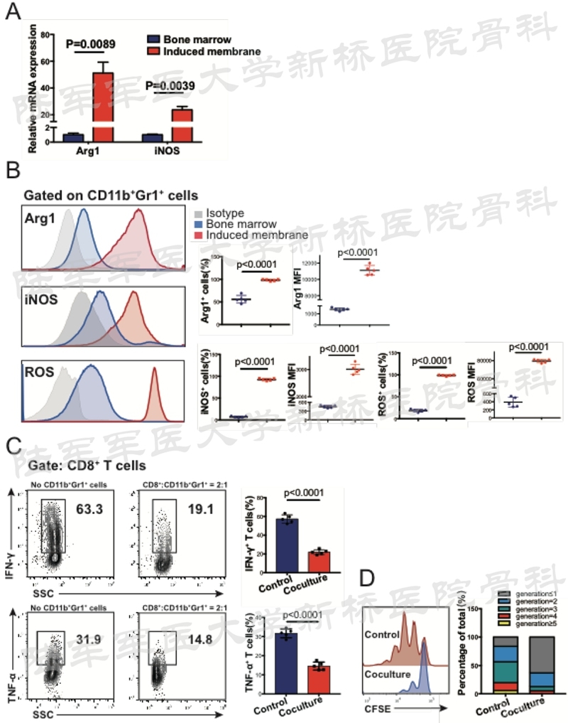 以上研究结果表明:在诱导膜炎症微环境刺激下,骨髓中的CD11b+Gr1+细胞大量活化为髓源性抑制细胞(MDSC)。