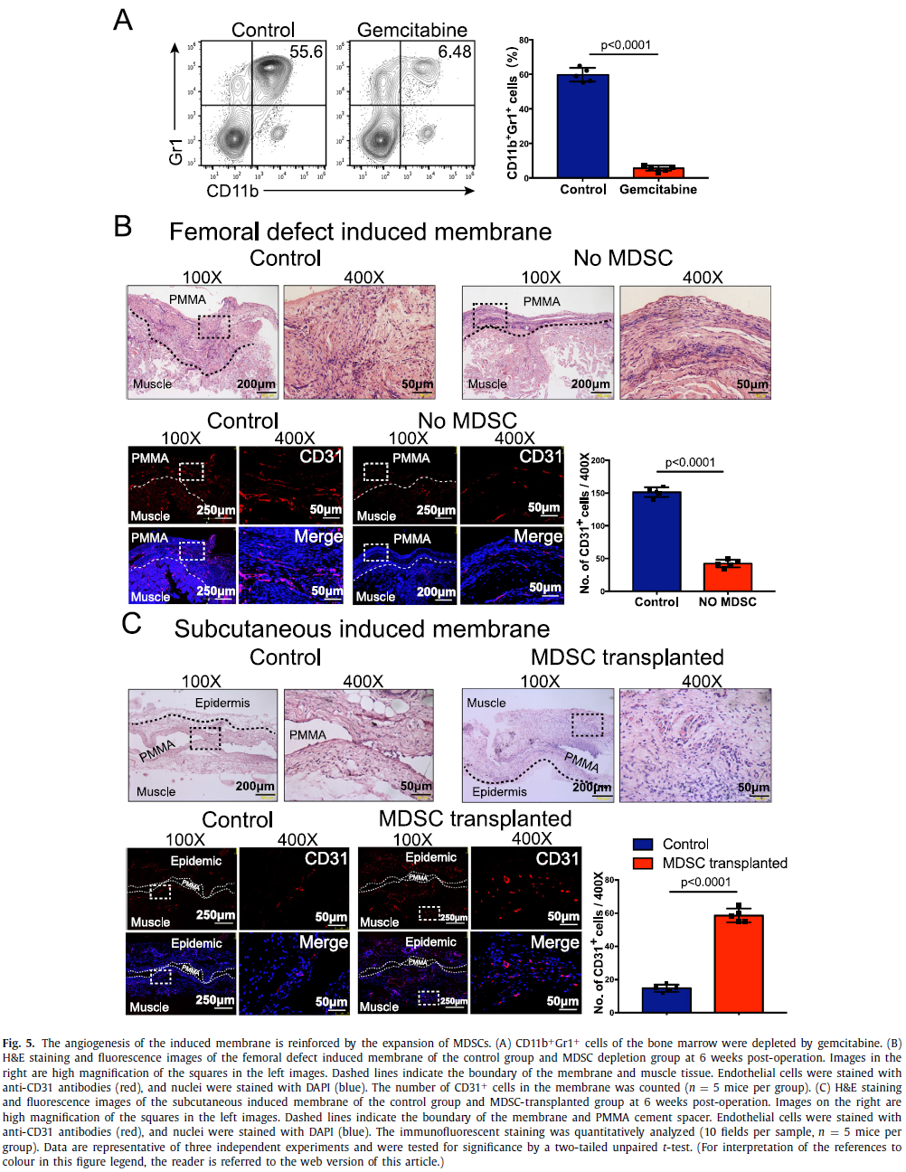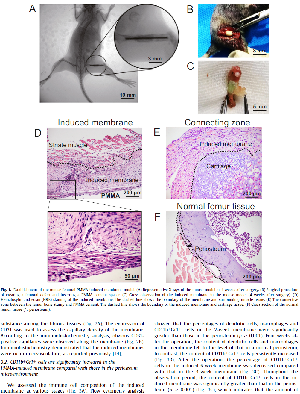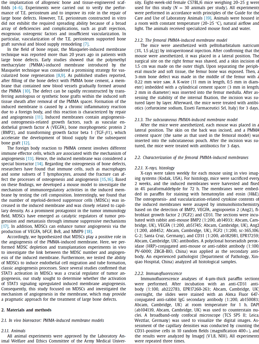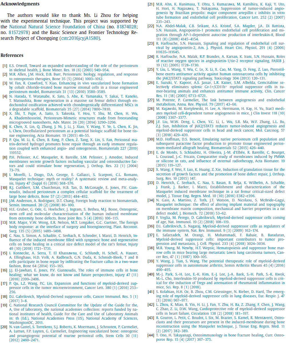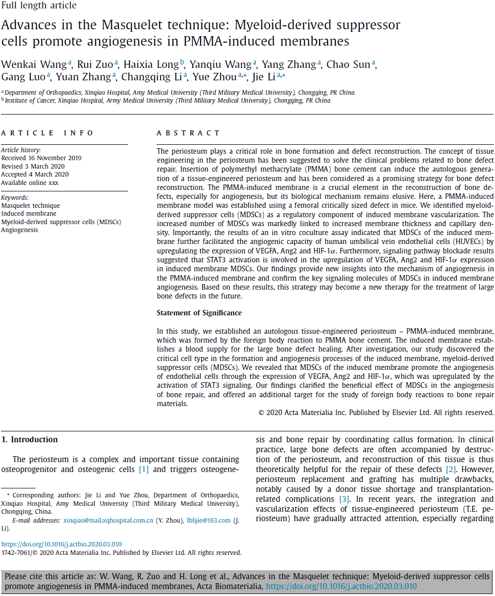 以上研究成果以“Advances in the Masquelet technique: Myeloid-derived suppressor cells promote angiogenesis in PMMA-induced membranes”为题,于2020年3月9日在线发表在生物材料领域顶级期刊《Acta Biomaterialia》(IF:6.638)。