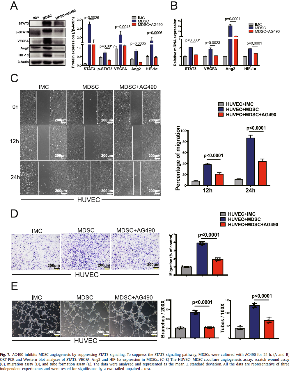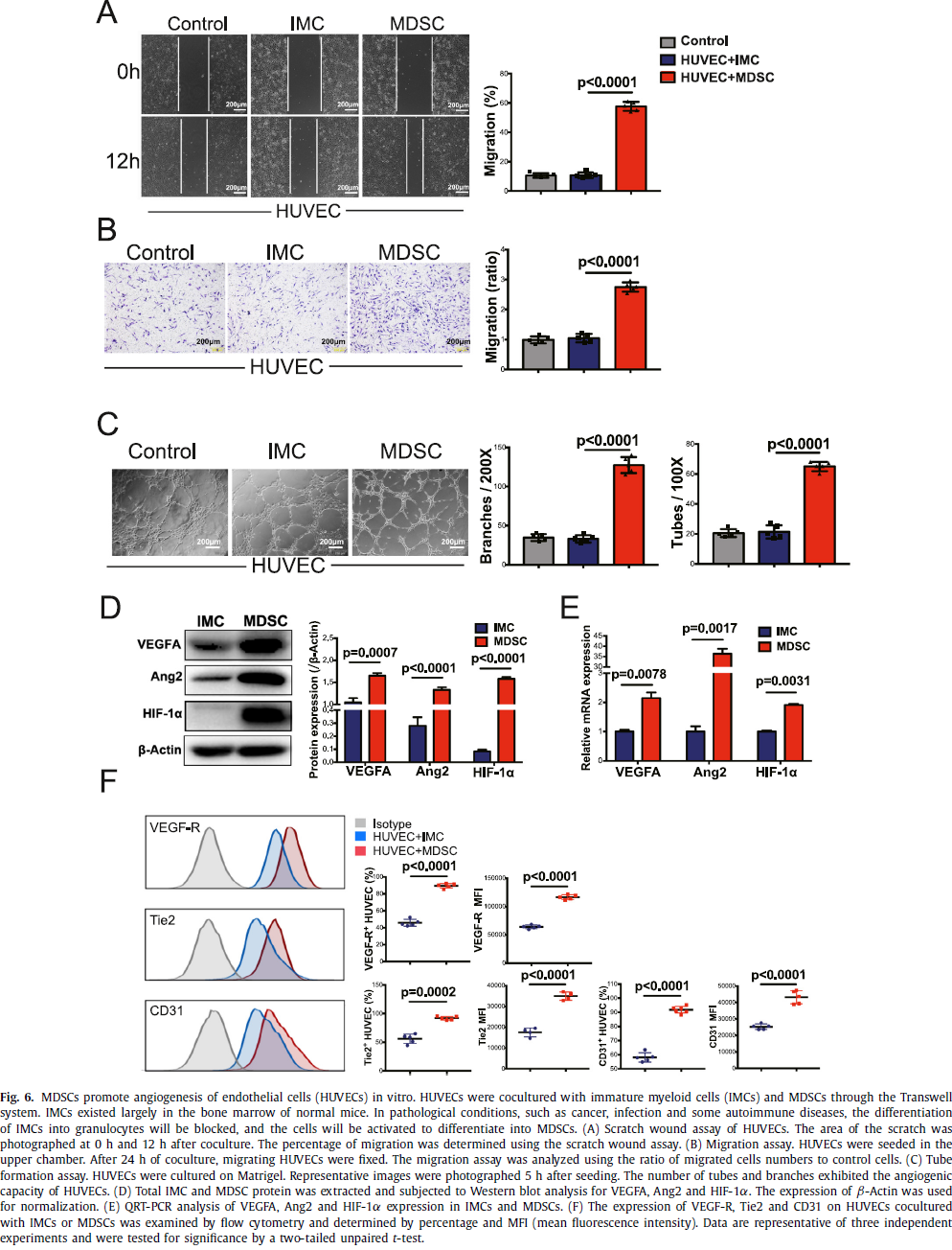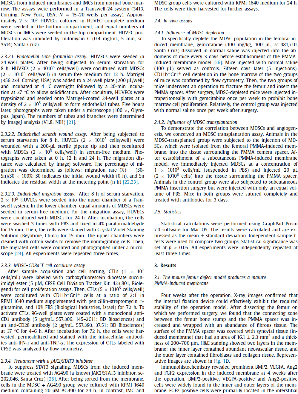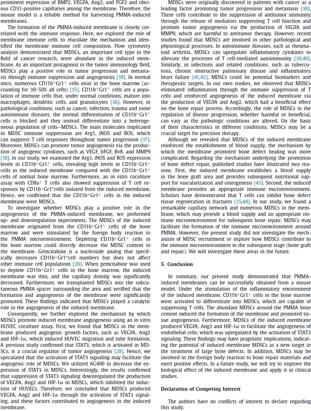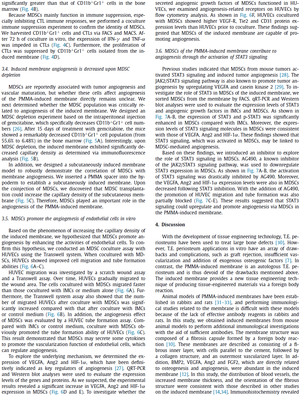 PMMA骨水泥周围大量的MDSC促进了诱导膜的形成和膜内血管化。此外,诱导膜中MDSCs通过上调STAT3信号,分泌VEGFA,Ang2和HIF-1α促进内皮细胞血管生成。这些发现揭示了MDSCs在诱导膜促进骨缺损修复中的重要作用。未来,MDSCs可能作为大段骨缺损修复新的治疗靶点。