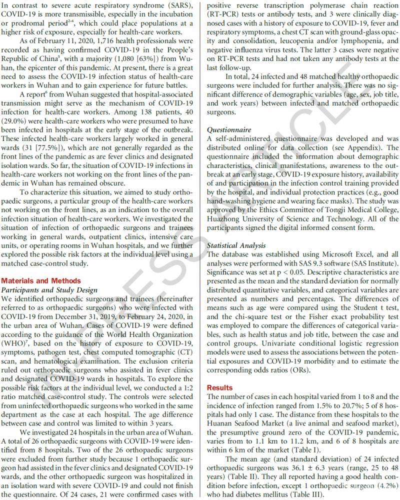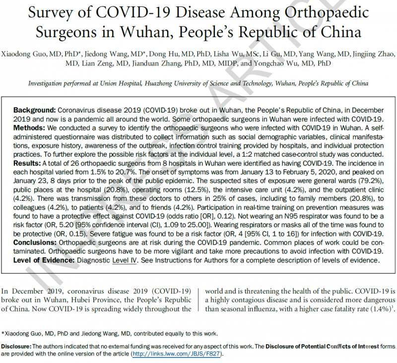 Xiaodong Guo, Jiedong Wang, Dong Hu, Lisha Wu, Li Gu, Yang Wang, Jingjing Zhao, Lian Zeng, Jianduan Zhang, Yongchao Wu. Survey of COVID-19 Disease Among Orthopaedic Surgeons in Wuhan, People's Republic of China. The Journal of Bone & Joint Surgery, 2020.DOI:10.2106/JBJS.20.00417.
