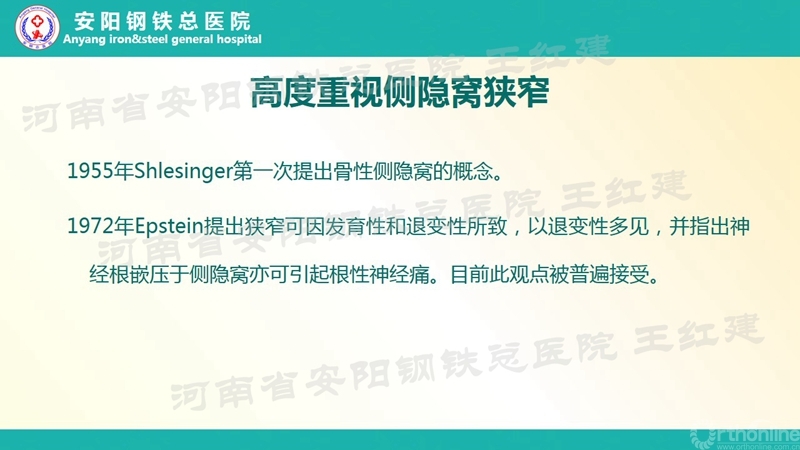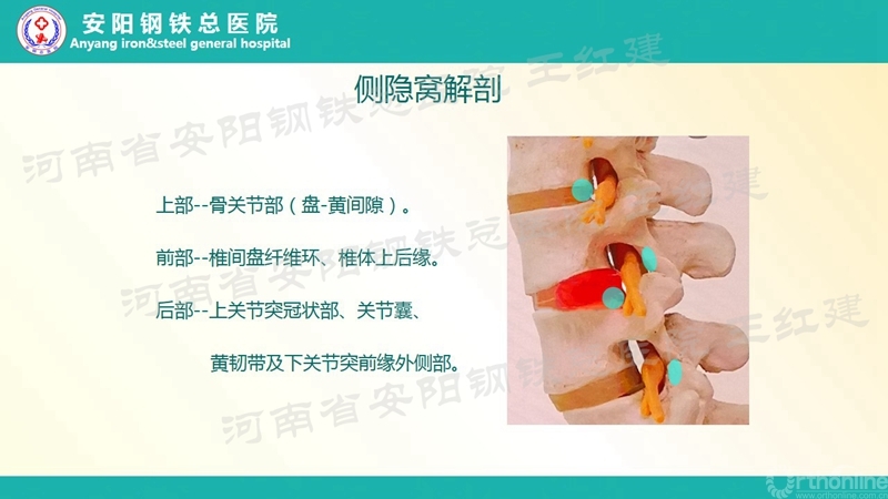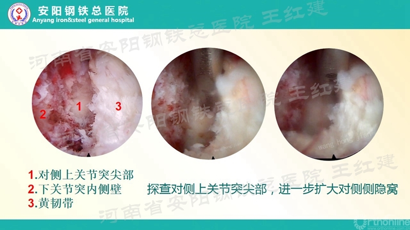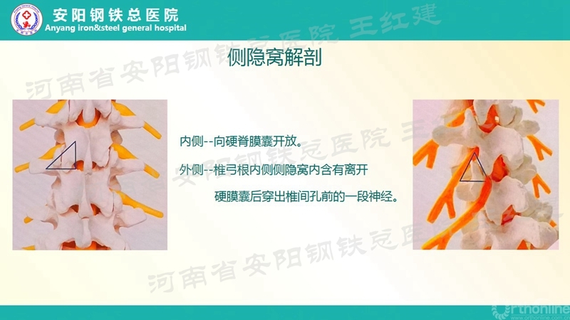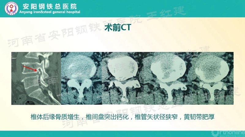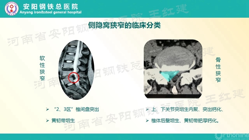 其狭窄因素主要来自三个方面,表现为腹侧的间盘后突、钙化、椎体后缘骨质增生,后纵韧带肥厚、骨化;侧方的上关节突增生内聚,椎弓根旁沟骨质增生;背侧的黄韧带增厚,钙化,下关节突增生。其中上关节突的增生内聚是导致侧隐窝骨性狭窄的主要因素。