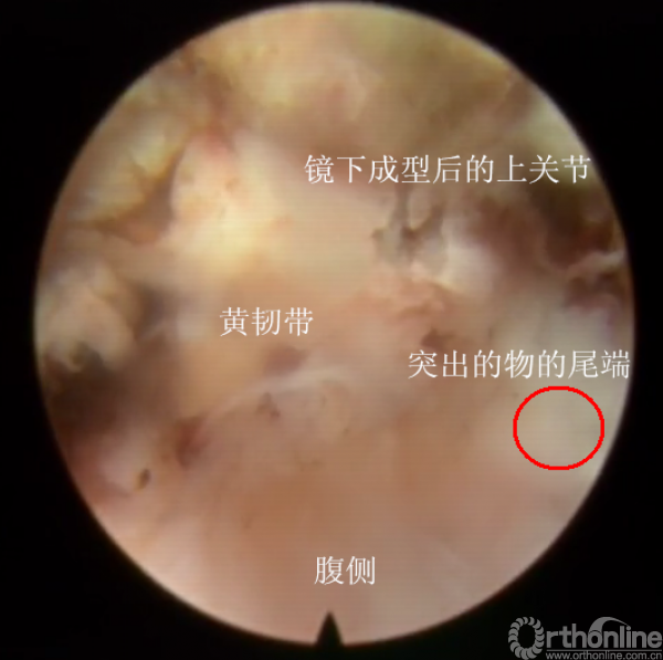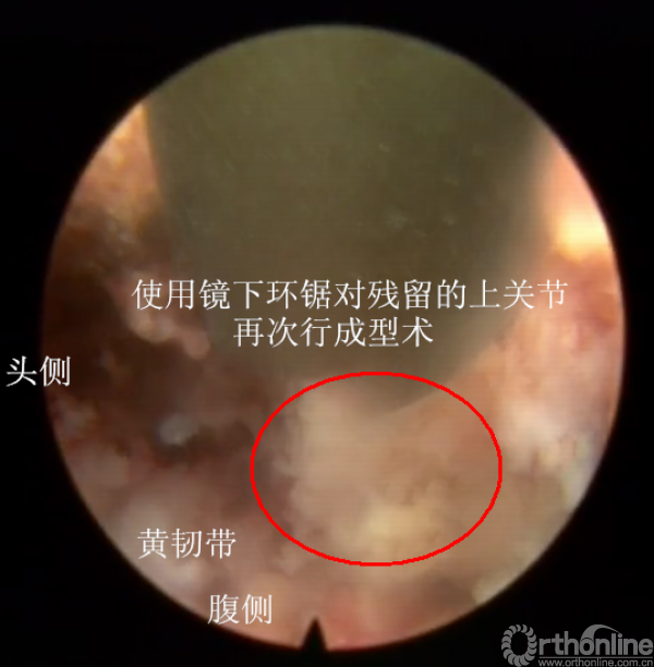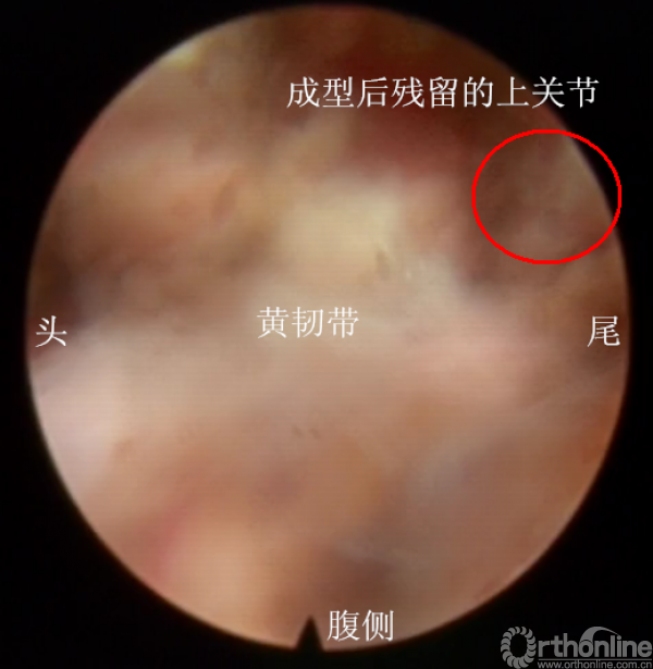 镜下显示置管正中靶点,但上关节突部分残留,予以镜下再次成型