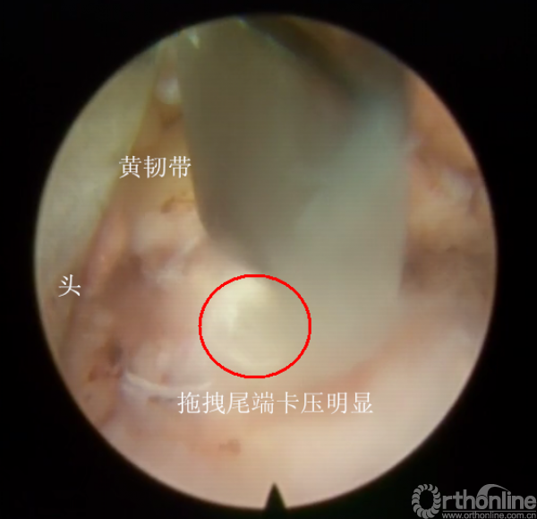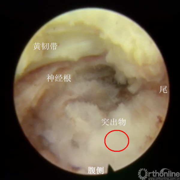 工作套管往尾端移后,见一突出物,且相应节段的神经根波动差