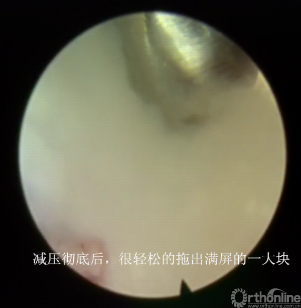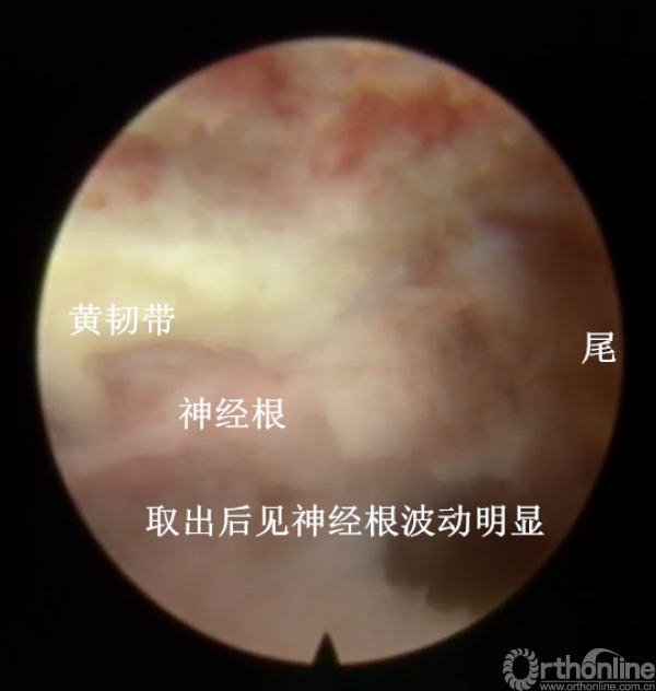 逐步减压后,取出突出物后,见整个走行的神经根波动明显