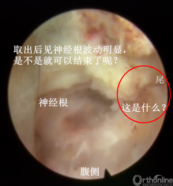 7、 术中不能以影像学上资料来判断突出物的大小,镜下仔细探查神经根头尾侧没有残留,看到相应神经根波动明显,才能结束手术;