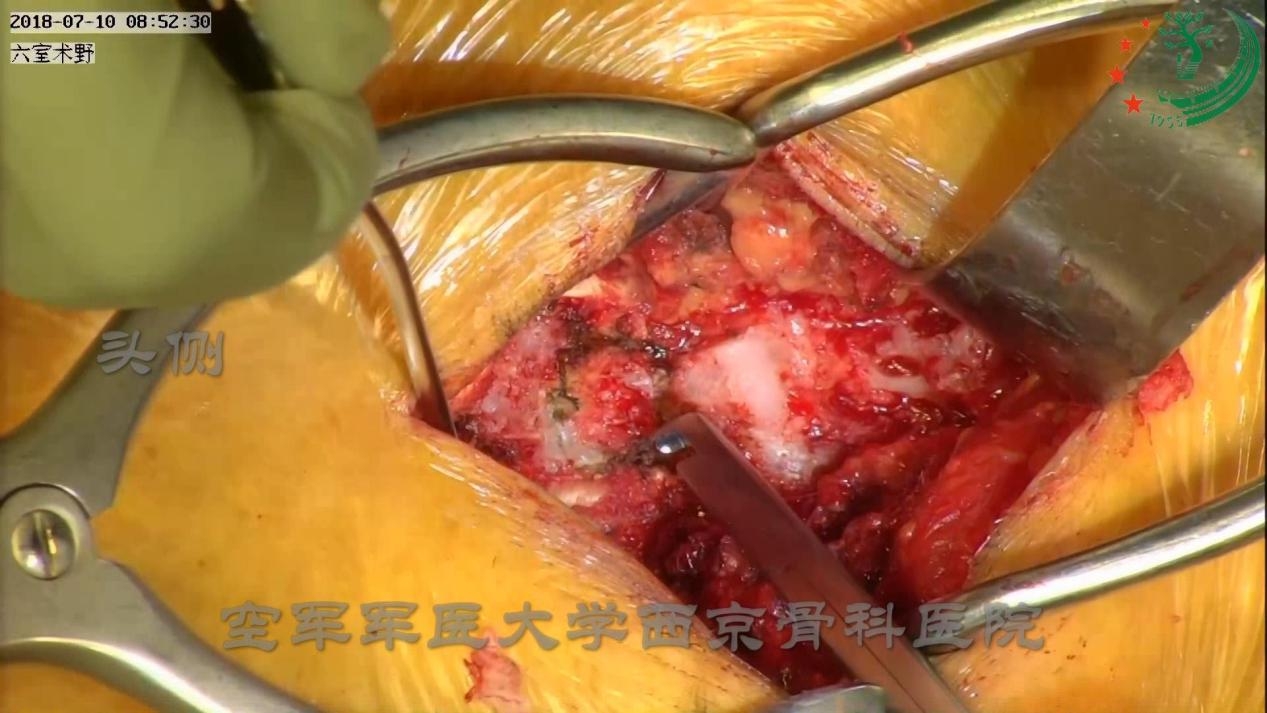 术中用骨刀打断棘突根部并将肌肉剥离致对侧