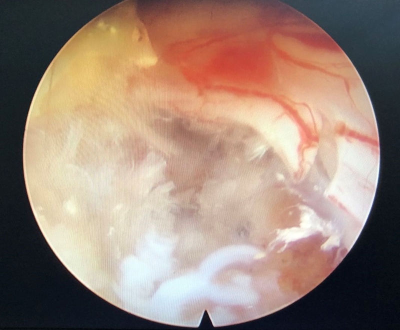 硬脊膜撕裂一般由于镜下操作不当产生机械性损伤引起,也可在行椎间孔成形的过程中环锯或磨钻使用,超过椎弓根内缘而损伤硬脊膜。文献报道发生率在1%左右,其大多发生在突出间盘较大、组织黏连较为严重的病例中,其次,也与手术医师暴力操作、手术视野不佳有关。