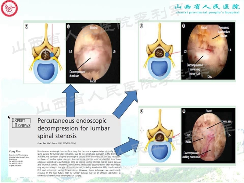 Ahn从经皮椎间孔镜技术治疗不同部位腰椎管狭窄症的手术技巧方面总结了一些他的方法,并讨论了针对不同部位腰椎管狭窄是选择经椎板间隙入路还是选择经椎间孔入路的优势与不足。