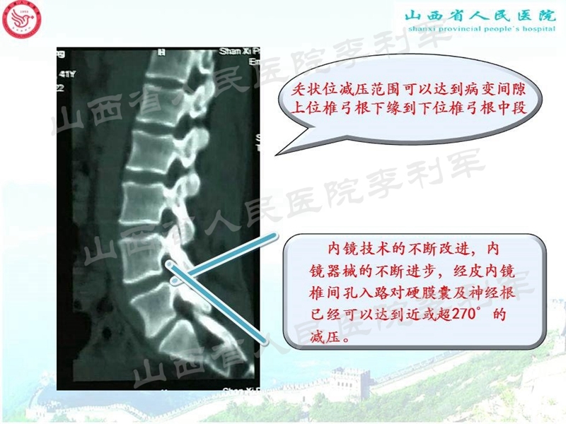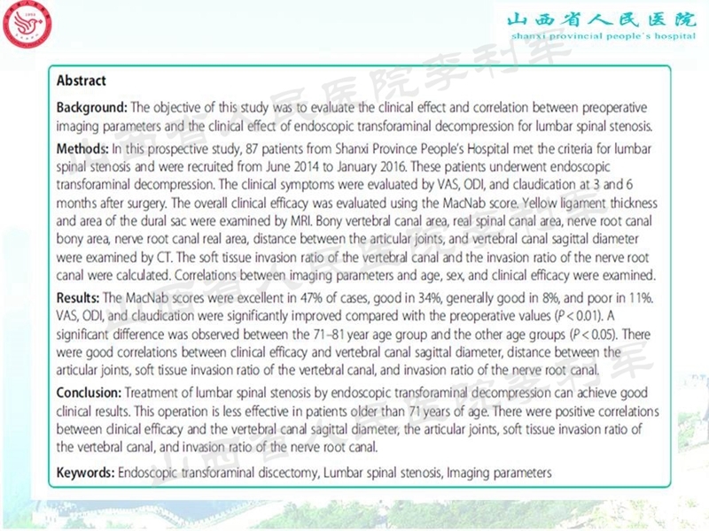 山西省人民医院李利军医生根据自己的临床技术体会及病例分析,总结了一些椎间孔镜椎间孔入路治疗腰椎管狭窄症的初步技术体会,和大家分享,希望的到大家的批评与指导。