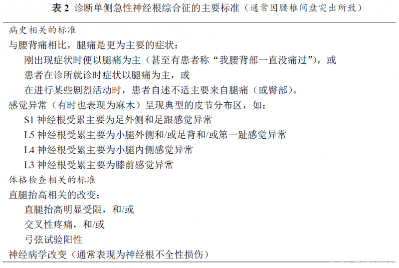 因为破裂的髓核组织可压迫运动、感觉、交感神经纤维或脊神经后根神经节,所以,腰椎间盘突出导致的坐骨神经痛有多种临床表现(表2)。腰椎间盘突出对神经根的作用包括压迫、牵张、炎症刺激,可单独致病,也可共同作用。随着时间的推移,神经根的病理改变可表现为炎症、水肿、神经内的纤维变性、脱髓鞘、轴索变性和再生等。因此,这也很好理解坐骨神经痛既没有一个确定的病因,也没有一个典型的临床表现。
